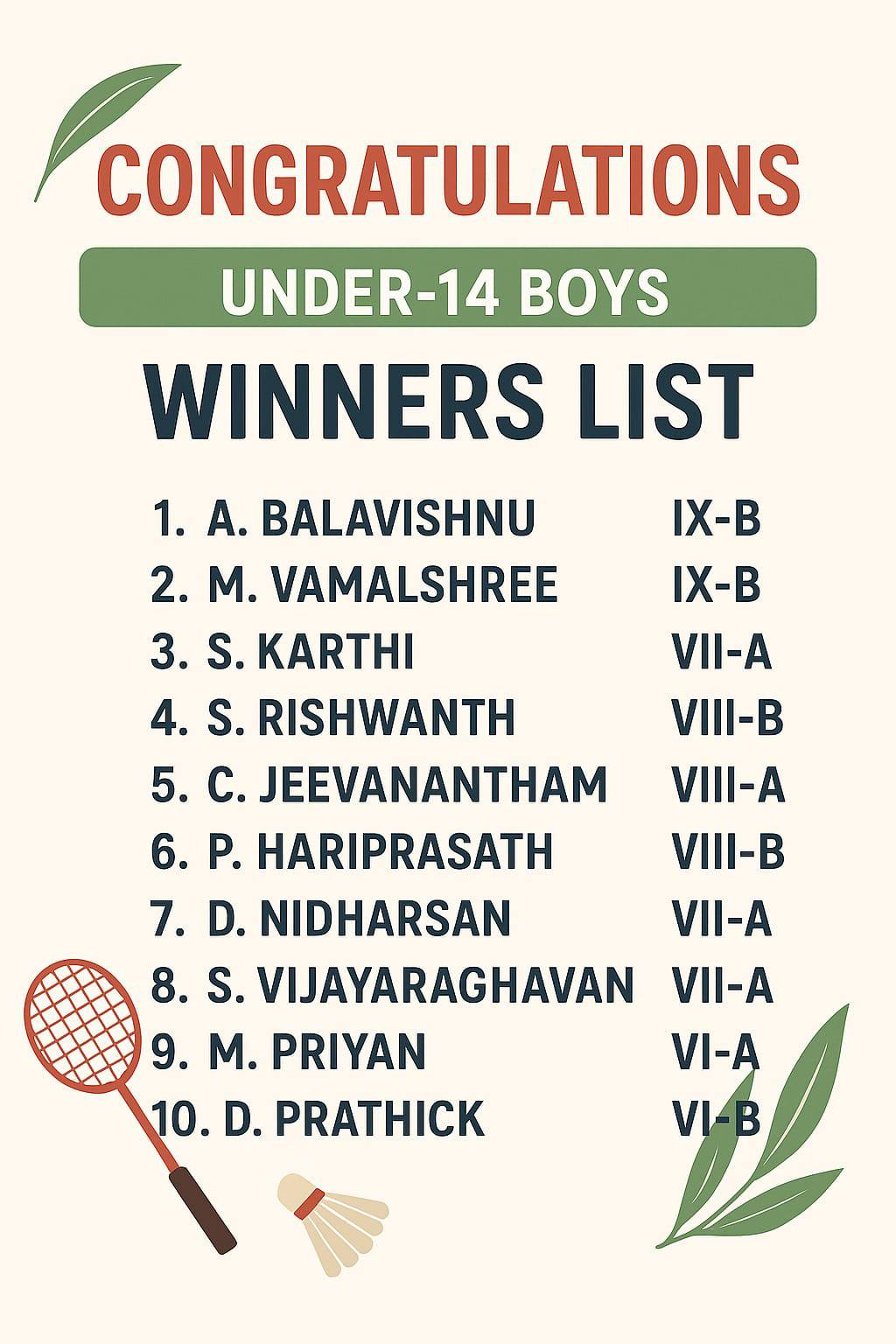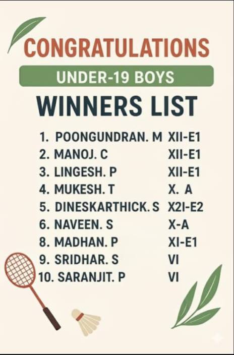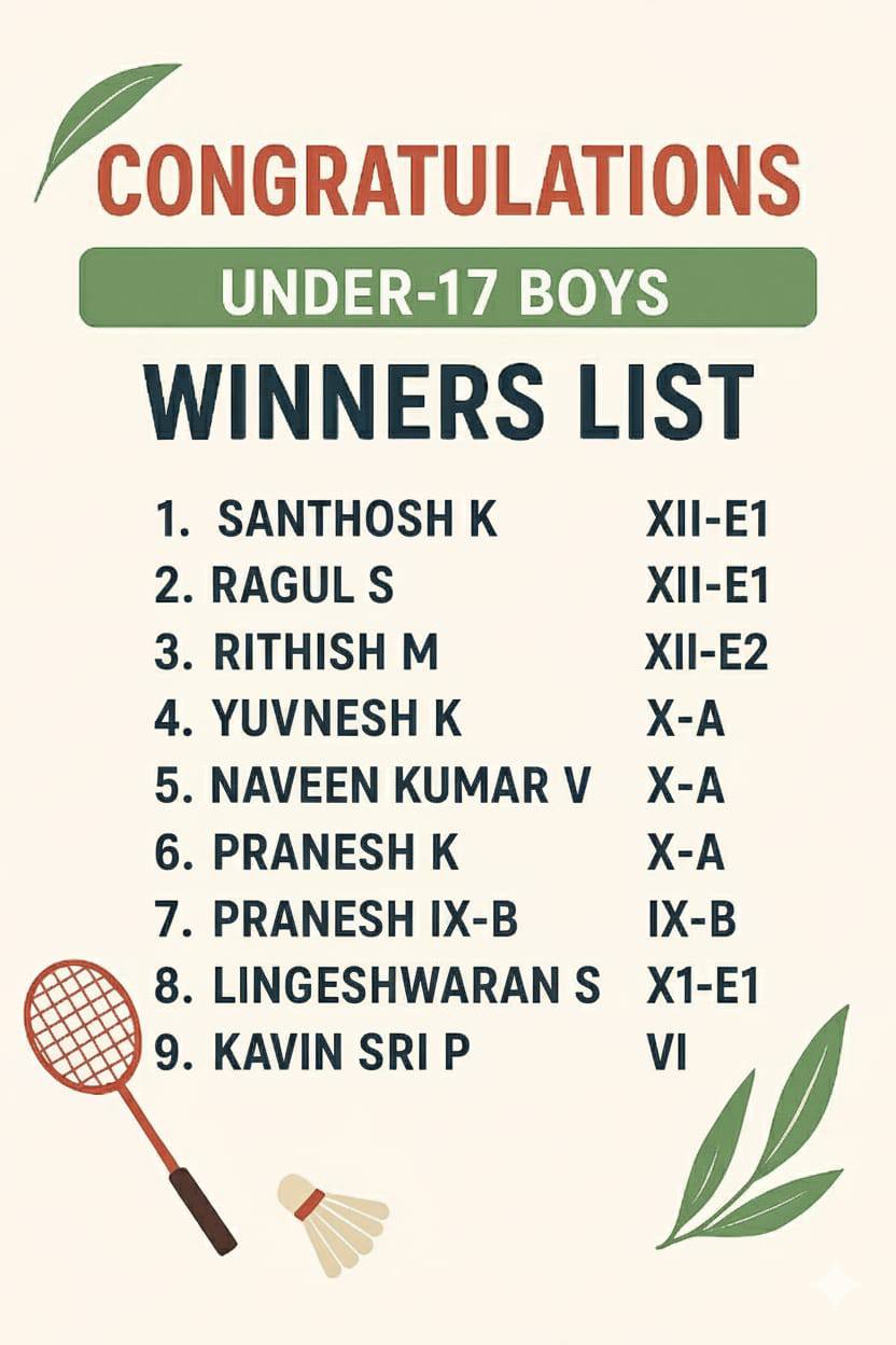 Hearty congratulations to all the winners and the dedicated coaches Mr.A.Marimuthu& Mr.R.Ravi who made this achievement possible! Your hard work, team spirit, and determination have brought glory to our school.
