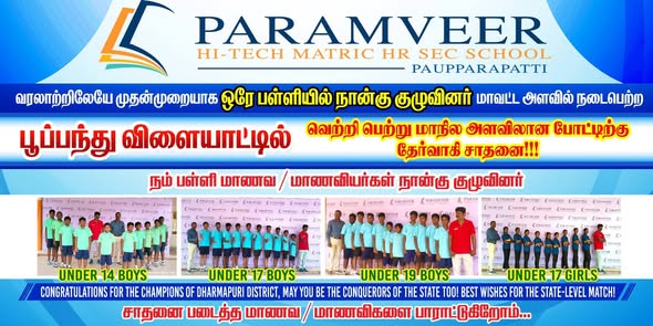 Our students’ dedication has made Paramveer, Paupparapatti proud in Ball Badminton! We’re thrilled to announce a phenomenal performance that created history – four state level Ball Badminton teams from Dharmapuri District, making us the district dominators with victory and glory ahead!